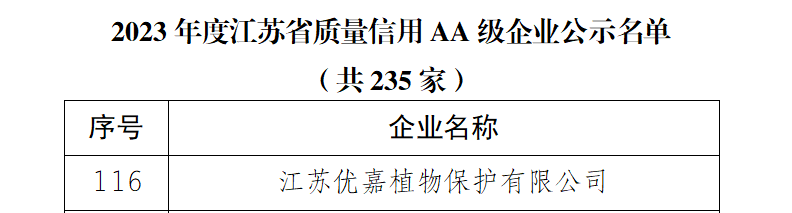 近日,江苏省市场监督管理局发布《2023年度江苏省质量信用AA级企业公示名单》,优嘉植保荣膺榜单!