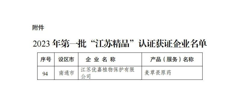 我司子公司优嘉植保获“江苏精品”企业认证