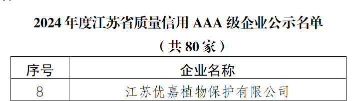 近日,我司子公司优嘉植保成功获评江苏省质量信用AAA级企业。企业信用等级是根据企业信用记录、履约能力、经营状况、盈利能力等指标对企业进行综合评估的结果,AAA信用认证代表着企业在市场中的高度认可度和良好信誉,是企业公信力和影响力的有力证明。