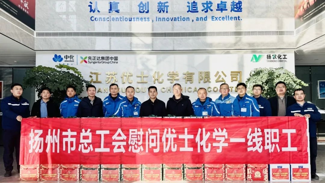 1月16日,扬州市总工会副主席韩士军一行来到IM体育优士化学开展春节慰问活动,IM体育工会主席张庆平、优士化学副总经理苏恩鹏等领导参加了慰问活动。