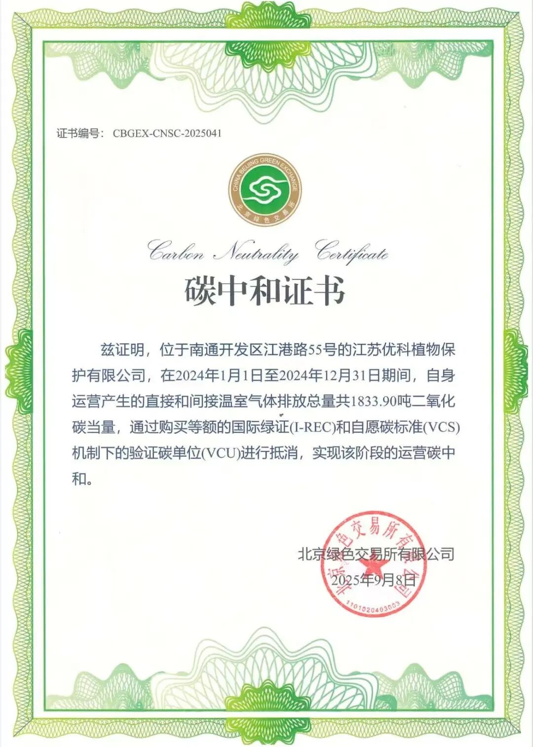 近年来,优科植保聚焦“智造升级 绿色赋能”发展导向,积极探索绿色低碳发展前沿阵地,深入推进污染防治攻坚战,追求高效清洁能源,加强科技创新,全方位高标准规划建设绿色工厂,并先后获得江苏省工信厅和石油化工环保联合会“绿色工厂”称号认证。优科植保以“零碳”为目标,深挖节能降碳潜力,积极创建“零碳工厂”。依据工厂实际运营情况,重视能源、碳排放管理体系制度的建设与执行,通过加强重点耗能车间和设备的能耗异常分析,及时更换高耗能低效率电机设备、淘汰高碳能源,有效减少能源浪费,实现二氧化碳减排近百吨。通过打造“零碳工厂”,优科植保 2024 年实现产量提升 15%,吨产品二氧化碳排放量降低 20.28%。未来,优科植保将以此次碳中和认证为全新起步,全面贯彻低碳零碳理念,持续促进能源低碳化和高效利用,科学规划能源、资源、产品、生产、运营、管理等各方面各环节的碳管理,构建全方位、多层次的碳减排碳中和体系,进一步深化高端化、智能化、绿色化一体发展。