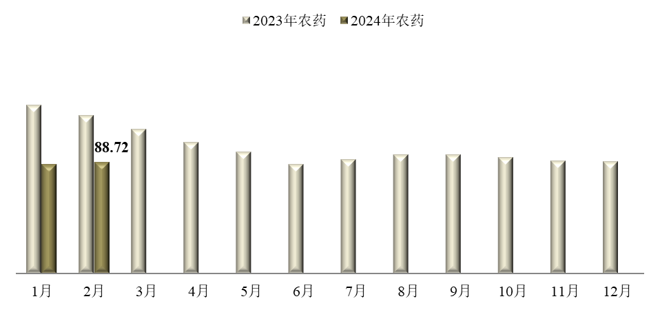 2月,中国农药价格指数止跌上扬。据中国农药工业协会统计,2月农药价格指数(CAPI)为88.72,环比上涨2.13%,同比下跌30.09%。