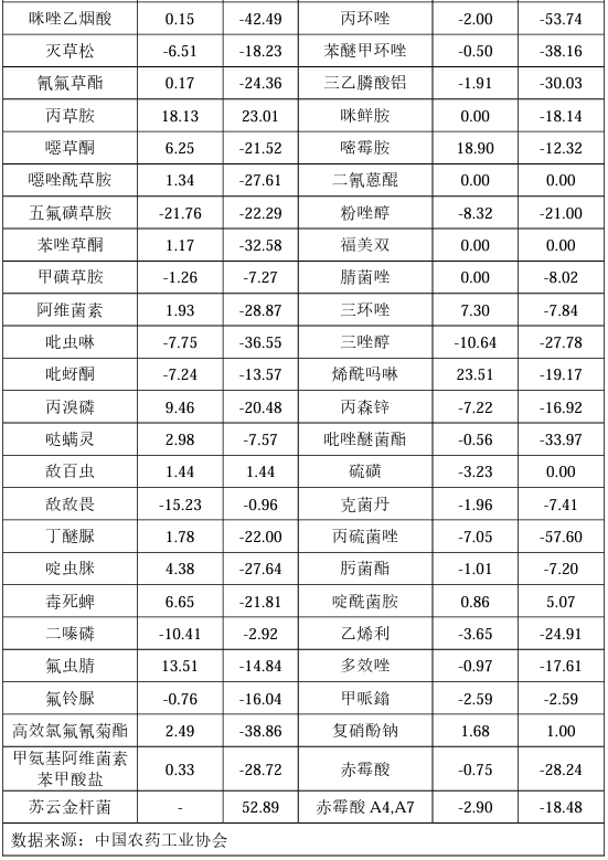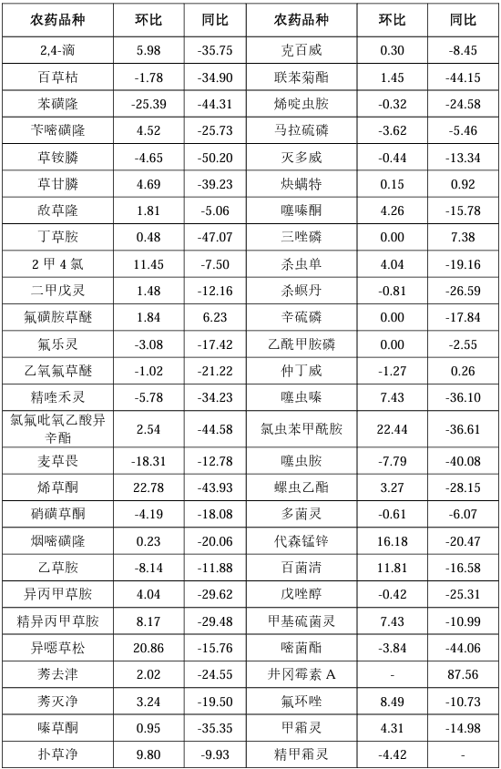 除草剂价格指数为87.92,环比上涨2.34%,同比下跌34.91%。监测在内的36种除草剂产品中,加权平均成交价格环比上涨的24种,环比下跌的12种;加权平均成交价格同比上涨的2种,同比下跌的34种。