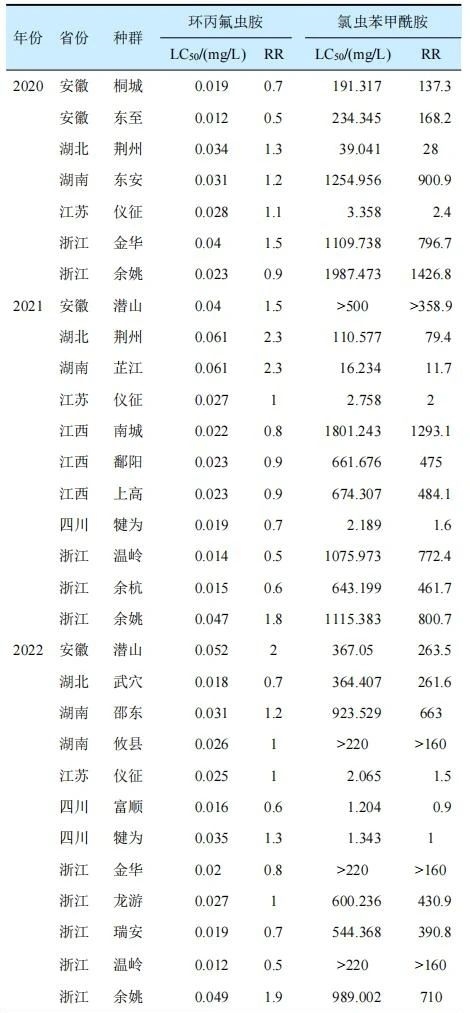 表1 2020—2023年环丙氟虫胺和氯虫苯甲酰胺对不同地区二化螟种群的RR值