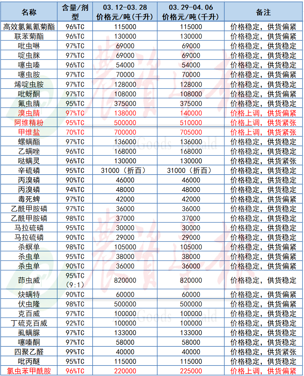 97%溴虫腈原药价格上涨2,000元,至140,000元/吨;95%阿维菌素精粉上涨10,000元,至510,000元/吨;70%甲氨基阿维菌素苯甲酸盐(简称“甲维盐”) 原药上涨5,000元,至705,000元/吨;96%氯虫苯甲酰胺原药上涨5,000元,至225,000元/吨。
